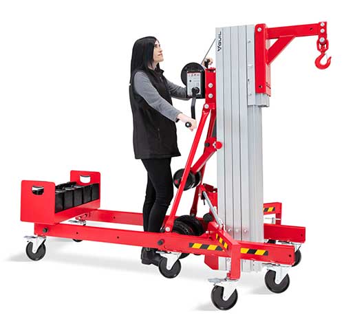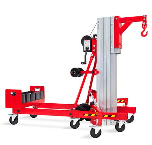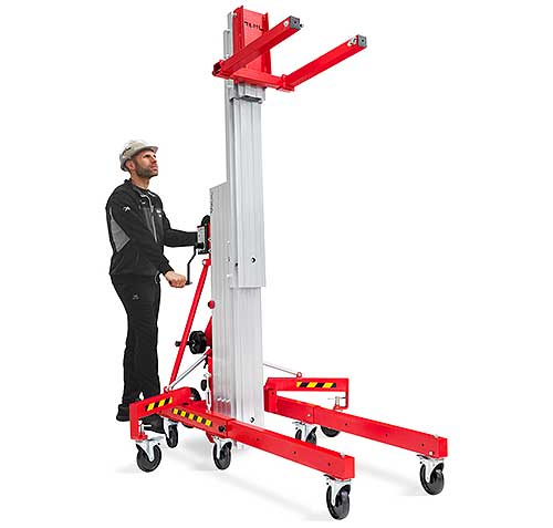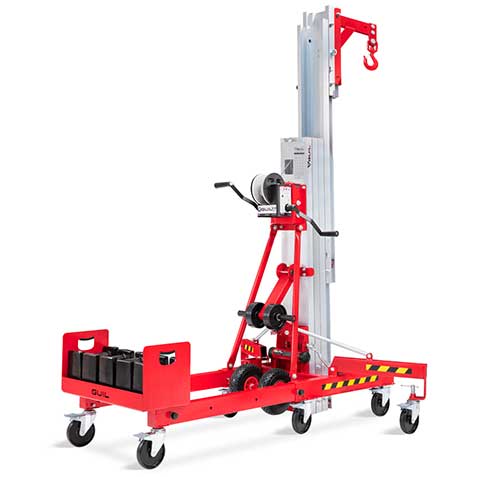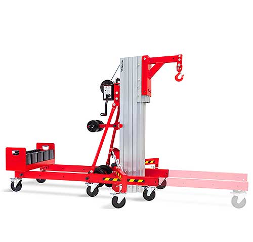 El Elevador de carga, provisto de 5 perfiles de aluminio extensibles mediante juegos de poleas, se suministra con todos los componentes y accesorios necesarios para su utilización: estabilizadores laterales con nivelador, horquillas, cabrestante de doble manivela, ruedas para su transporte en vertical y horizontal, etc.