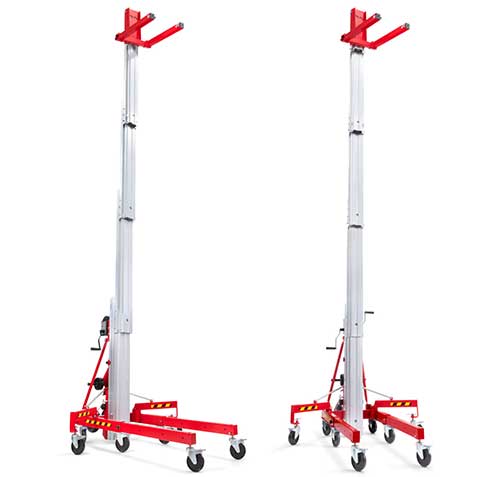 El Elevador de Carga TORO D-406, provisto de 4 perfiles de aluminio extensibles mediante juegos de poleas, se suministra con todos los componentes y accesorios necesarios para su utilización: estabilizadores laterales con nivelador, horquillas, cabrestante de doble manivela, ruedas para su transporte en vertical y horizontal, etc.